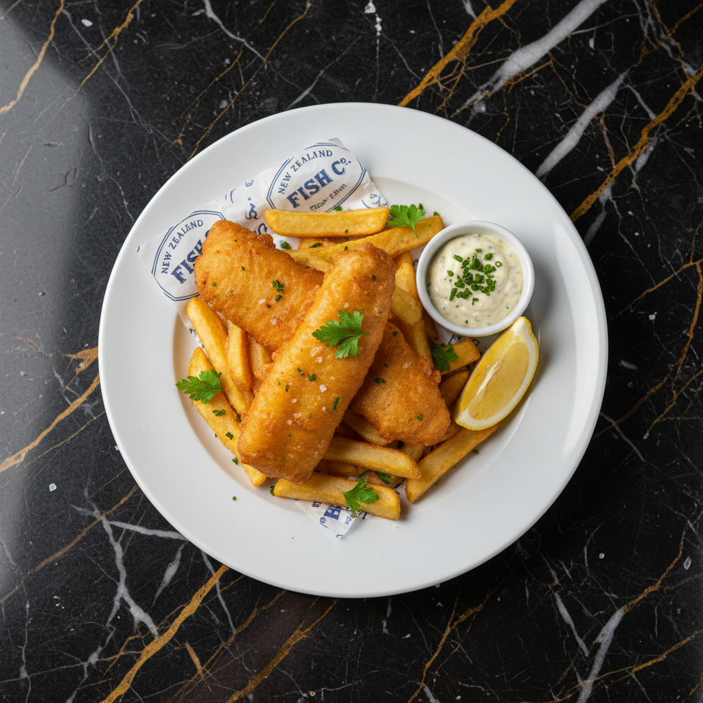 New Zealand's beloved Friday night tradition: perfectly battered fresh fish and hand-cut chips, traditionally served wrapped in paper with a side of tartare sauce and lemon.