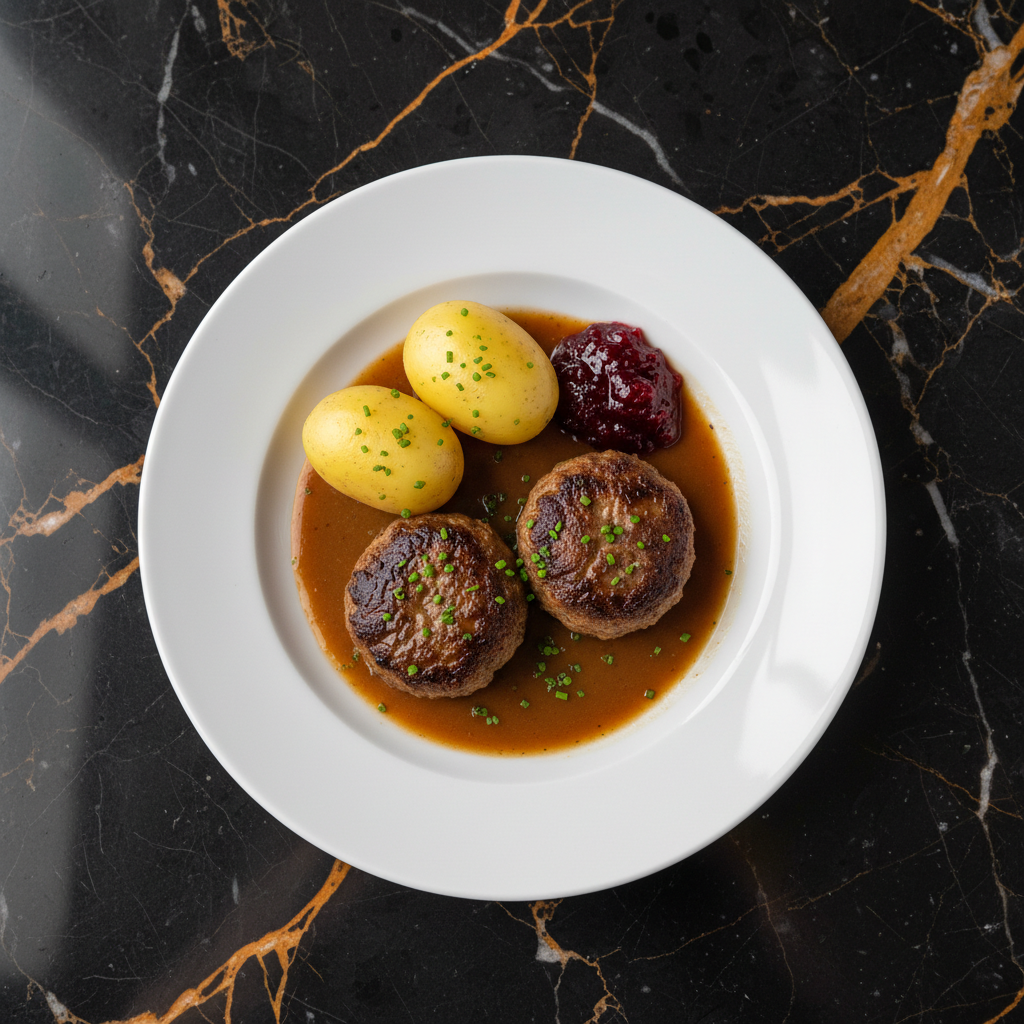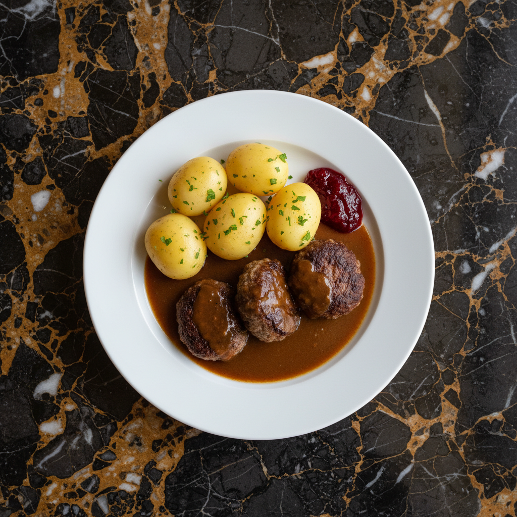 Traditional Norwegian meatballs (kjรธttkaker) served with a rich brown gravy, boiled potatoes, and lingonberry jam. A comforting and classic Norwegian home-style meal.
