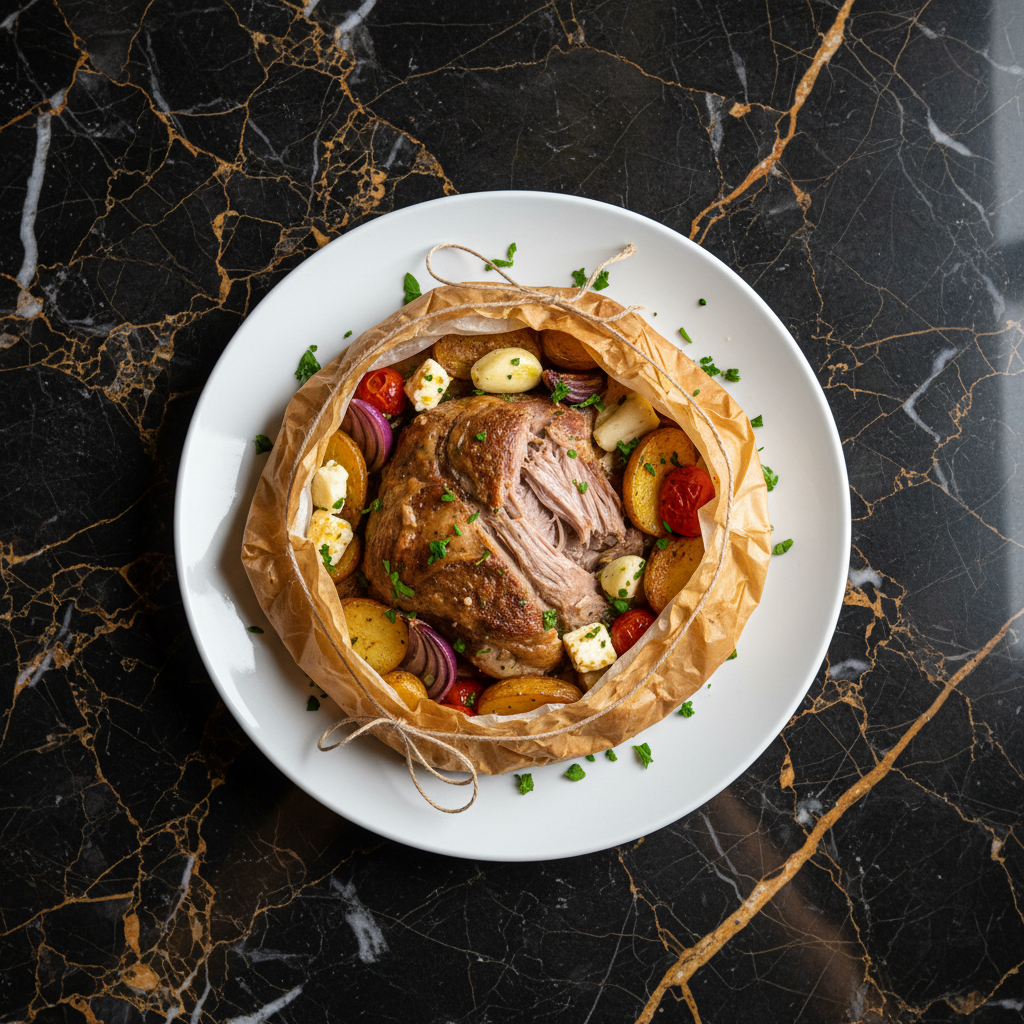 A rich and flavorful pot pie featuring slow-cooked lamb, vegetables, and herbs, encased in a flaky pastry crust. This dish is a modern interpretation of the traditional Kleftiko, adapted for a comforting, individual serving.
