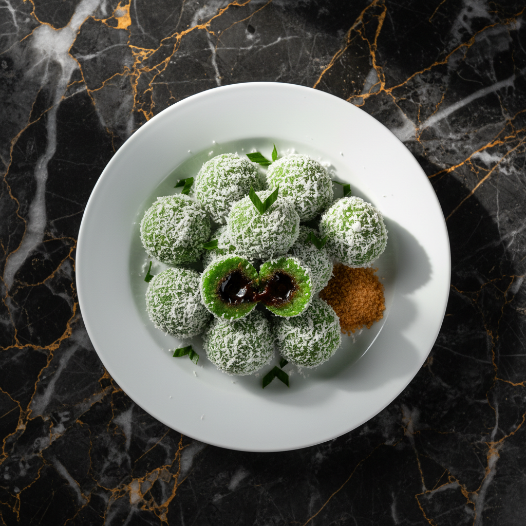 Klepon are delightful, chewy glutinous rice balls infused with pandan's fragrant aroma, filled with molten palm sugar, and coated in fresh grated coconut. A popular traditional sweet snack.