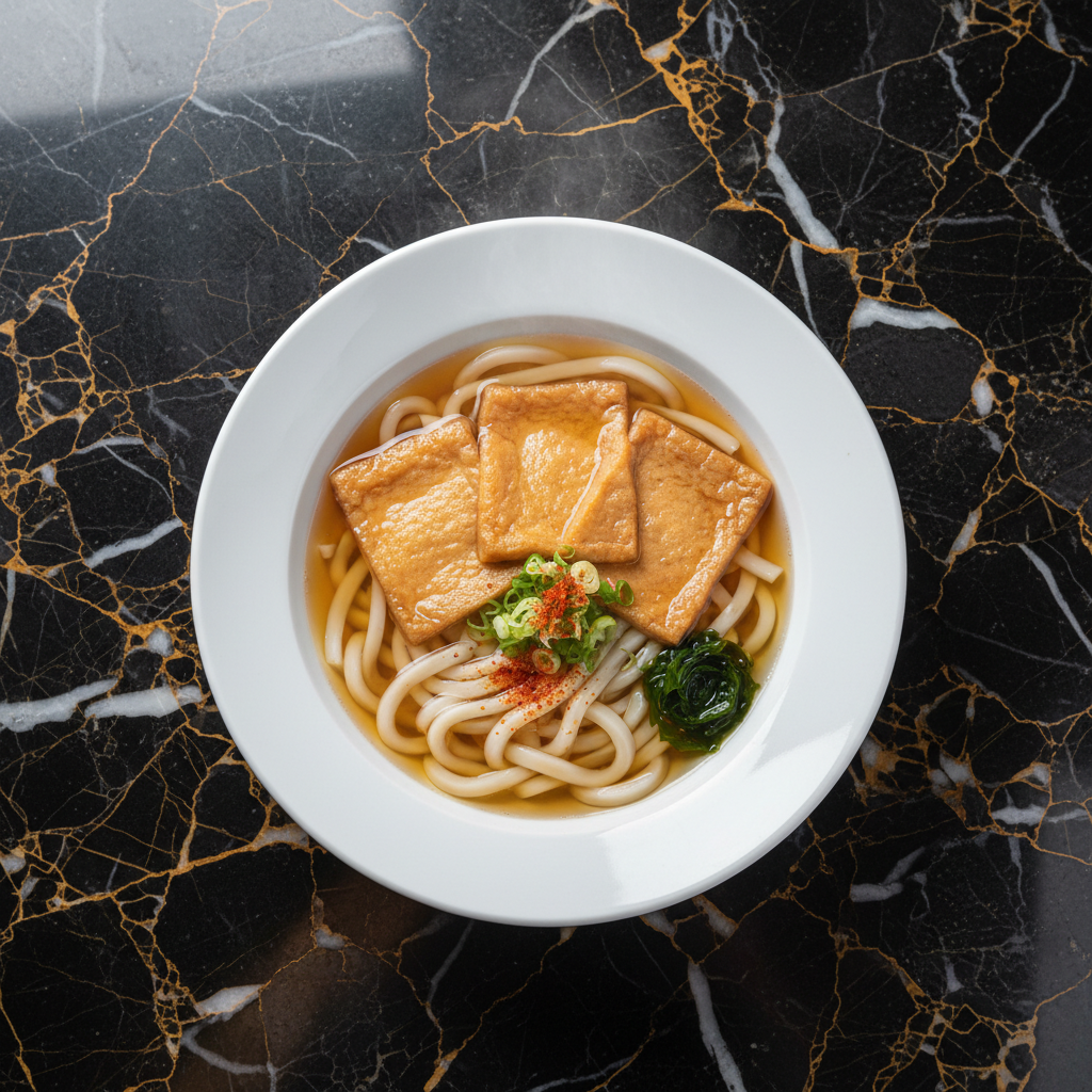A comforting and classic Japanese noodle soup featuring thick, chewy udon noodles in a savory dashi broth, topped with sweet and savory glazed fried tofu pouches (aburaage). The name 'Kitsune' (fox) is said to come from the fox's legendary love for fried tofu.