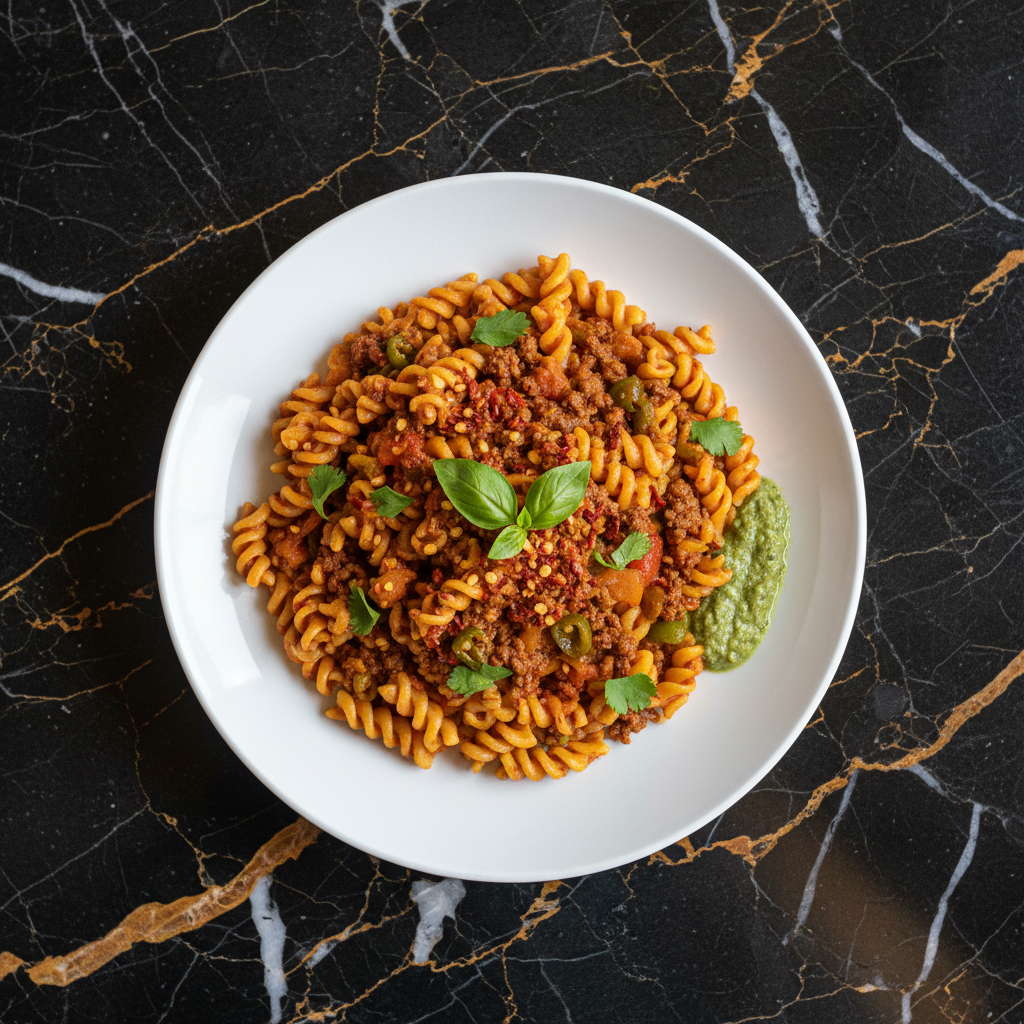 A popular and comforting Somali dish featuring pasta cooked in a rich, spiced tomato and minced meat sauce, often enjoyed as a hearty meal.