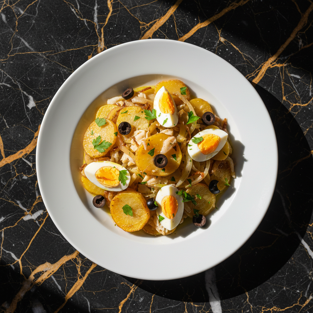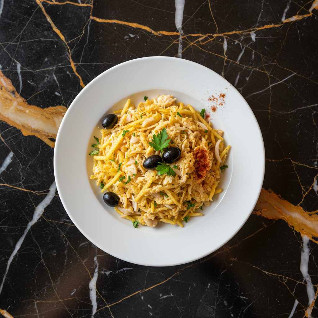 A beloved Portuguese comfort food, this dish features shredded salt cod (bacalhau) mixed with finely julienned fried potatoes, softened onions, garlic, and scrambled eggs, creating a wonderfully silky and satisfying texture. It's often garnished with black olives and fresh parsley.