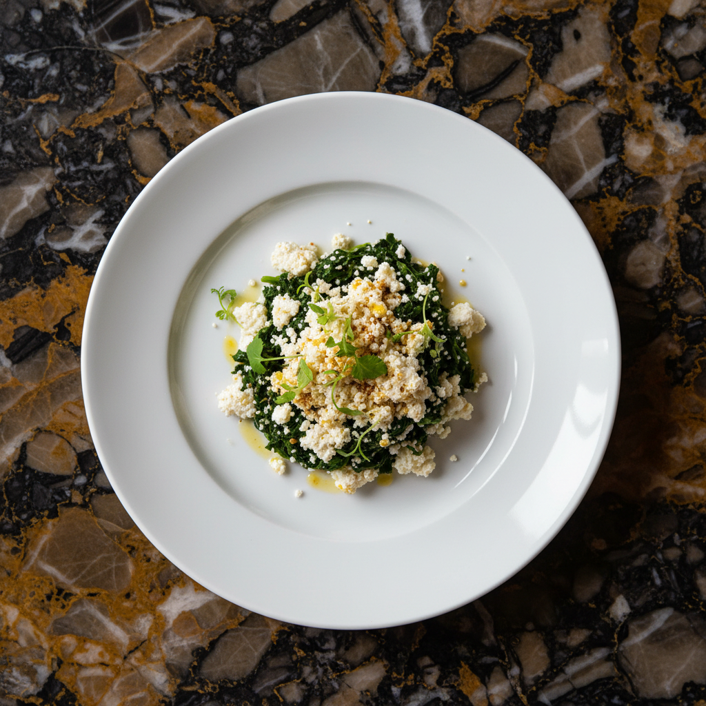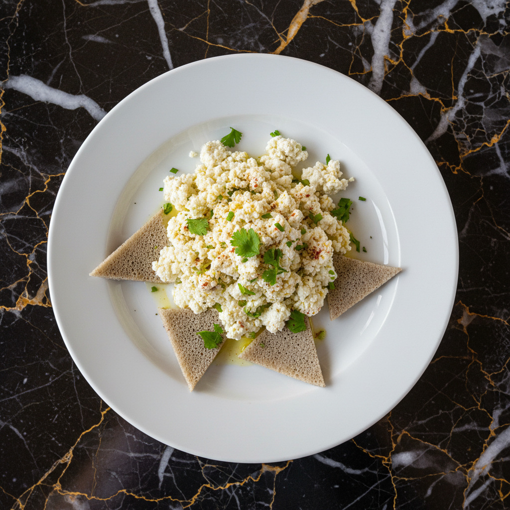 A simple yet flavorful Ethiopian dish featuring fresh, crumbly ayib cheese gently folded into tender, sautรฉed collard greens infused with aromatic niter kibbeh and garlic. It's a protein-rich, vegetarian side dish often served as part of a larger platter.