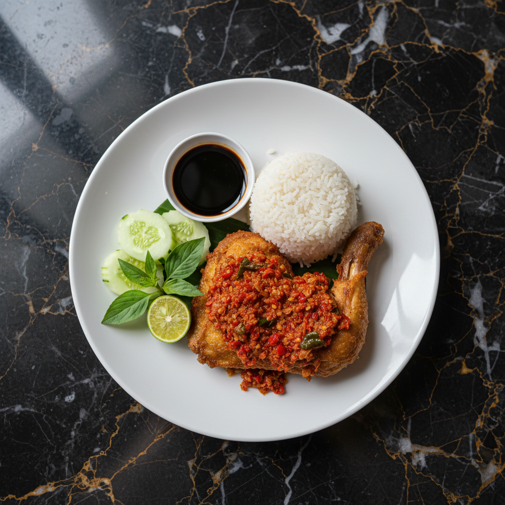 A popular East Javanese dish featuring crispy fried chicken that is smashed and coated in a flavorful, spicy sambal. Served with fresh raw vegetables (lalapan) and steamed rice.