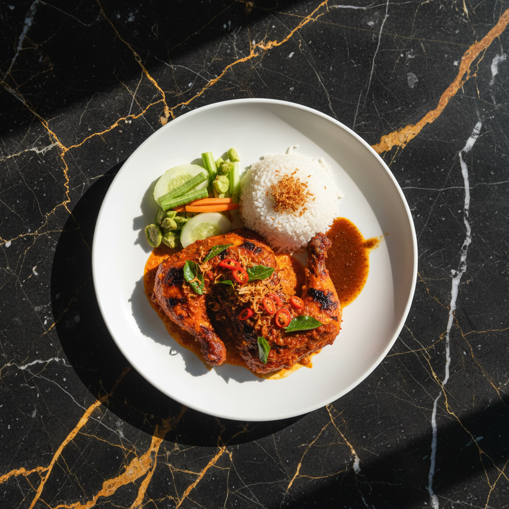 A classic East Coast Malaysian dish from Kelantan, featuring tender grilled chicken coated in a rich, spicy, and slightly sweet coconut milk and chili glaze. The char from grilling adds a wonderful smoky depth.
