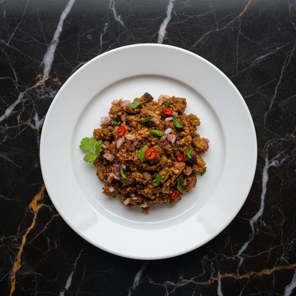 A smoky and flavorful mashed eggplant dish, often prepared by roasting the eggplant over an open flame, then mashing it with onions, chilies, and spices. It's a popular side dish in Bengali cuisine.