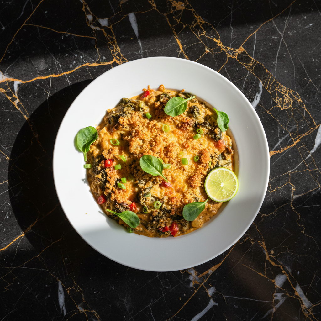 A savory and comforting baked dish featuring callaloo greens, often enriched with other vegetables and a creamy binder, topped with breadcrumbs and cheese for a delightful crust.