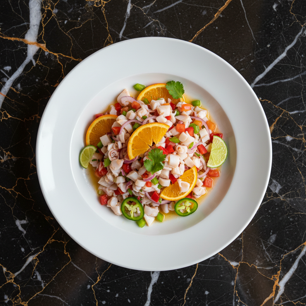A refreshing and zesty raw conch salad, a quintessential Bahamian appetizer or light meal, featuring finely chopped conch 'cooked' in citrus juices and mixed with fresh vegetables.