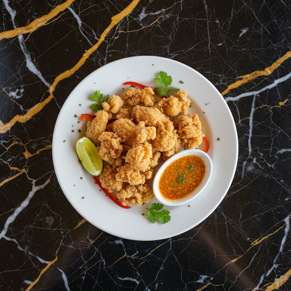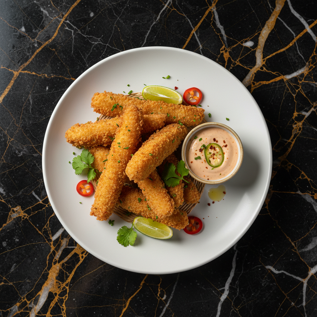 Crispy, golden-fried grouper strips served with a zesty and spicy homemade aioli, a popular appetizer or light meal.