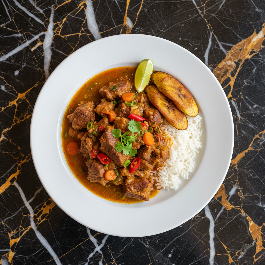 A rich and spicy stew featuring tender goat meat simmered in a flavorful broth infused with aromatic vegetables and the distinctive heat of goat peppers.