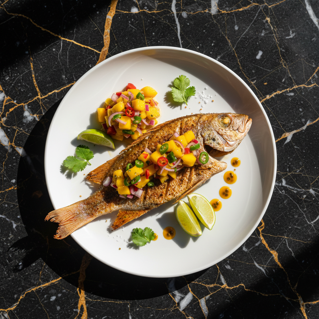 A vibrant and fresh dish featuring perfectly grilled snapper, a staple in Bahamian cuisine, complemented by a sweet and tangy mango salsa.