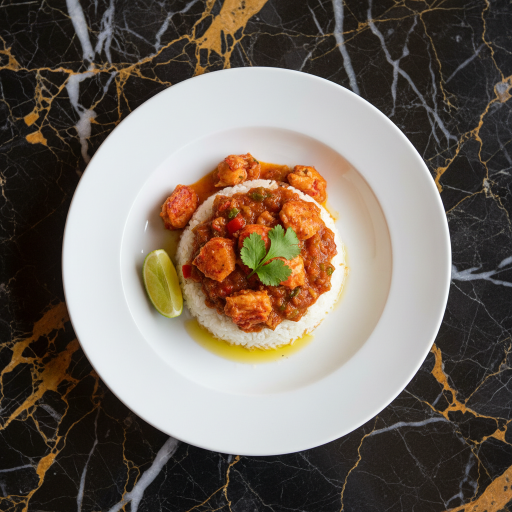 A rich and savory dish featuring tender morsels of lobster meat stewed in a zesty, tomato-based sauce with aromatic herbs and spices. It's often served over rice, making for a delightful and satisfying meal.