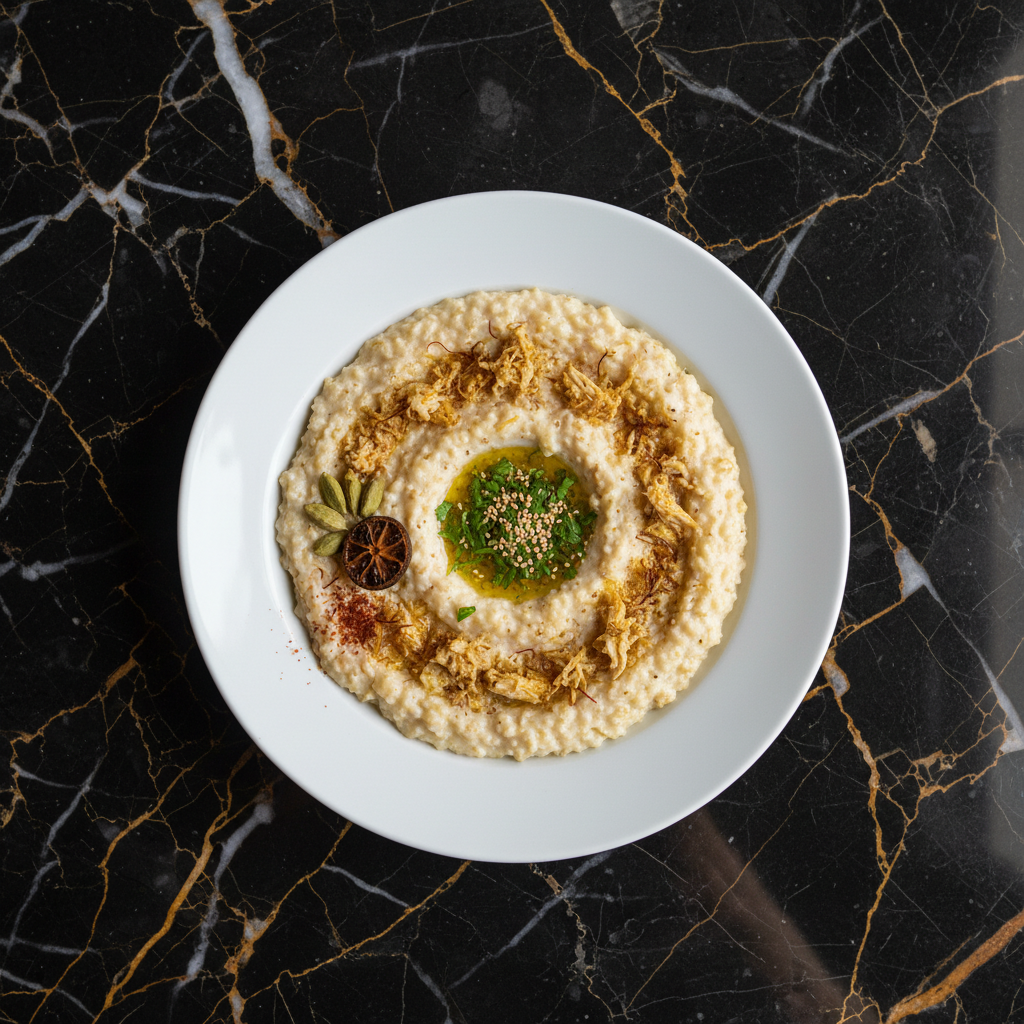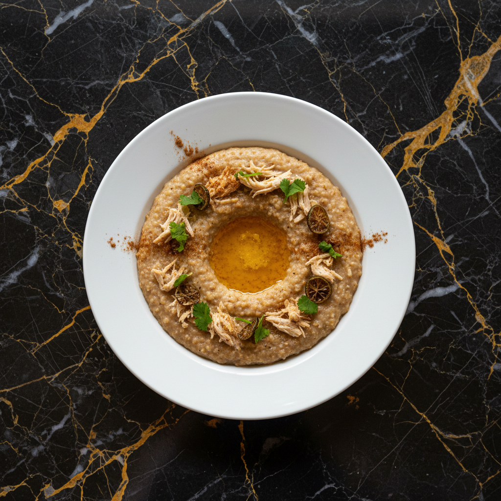 Harees is a traditional Bahraini dish made from cracked wheat and meat (typically chicken or lamb), slow-cooked to a creamy, porridge-like consistency. It's a hearty and comforting dish, often served during celebrations and Ramadan.