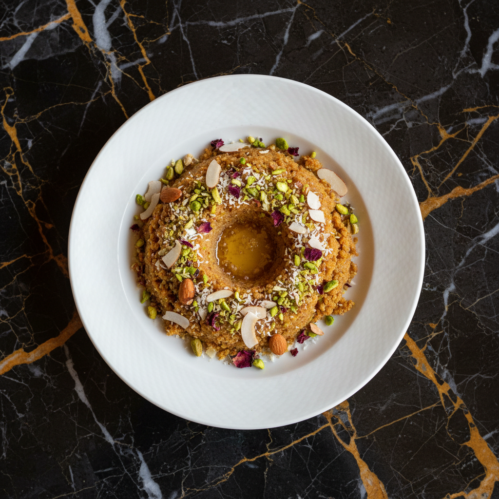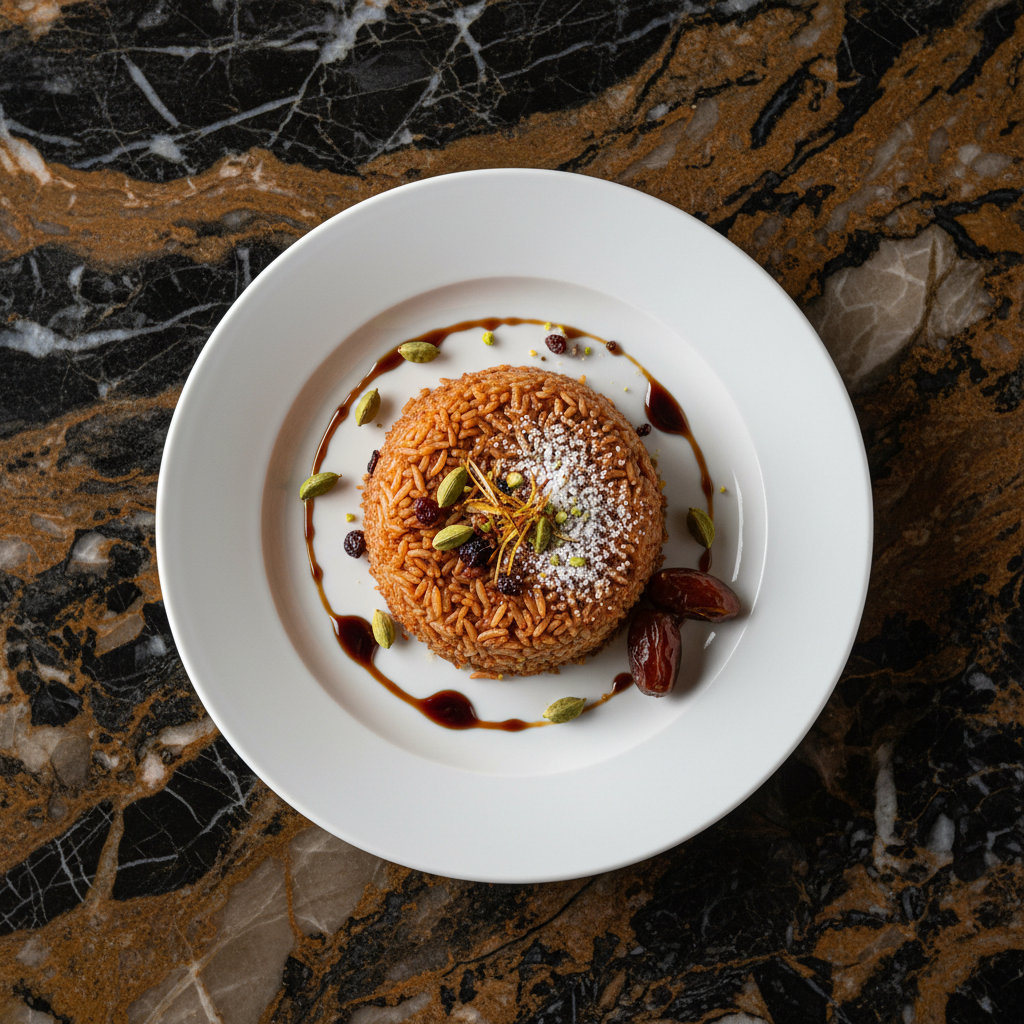 A fragrant and creamy rice pudding, infused with the delicate flavors of saffron and cardamom, and sweetened to perfection. This dessert is a comforting and elegant end to any meal, showcasing classic Bahraini dessert profiles.