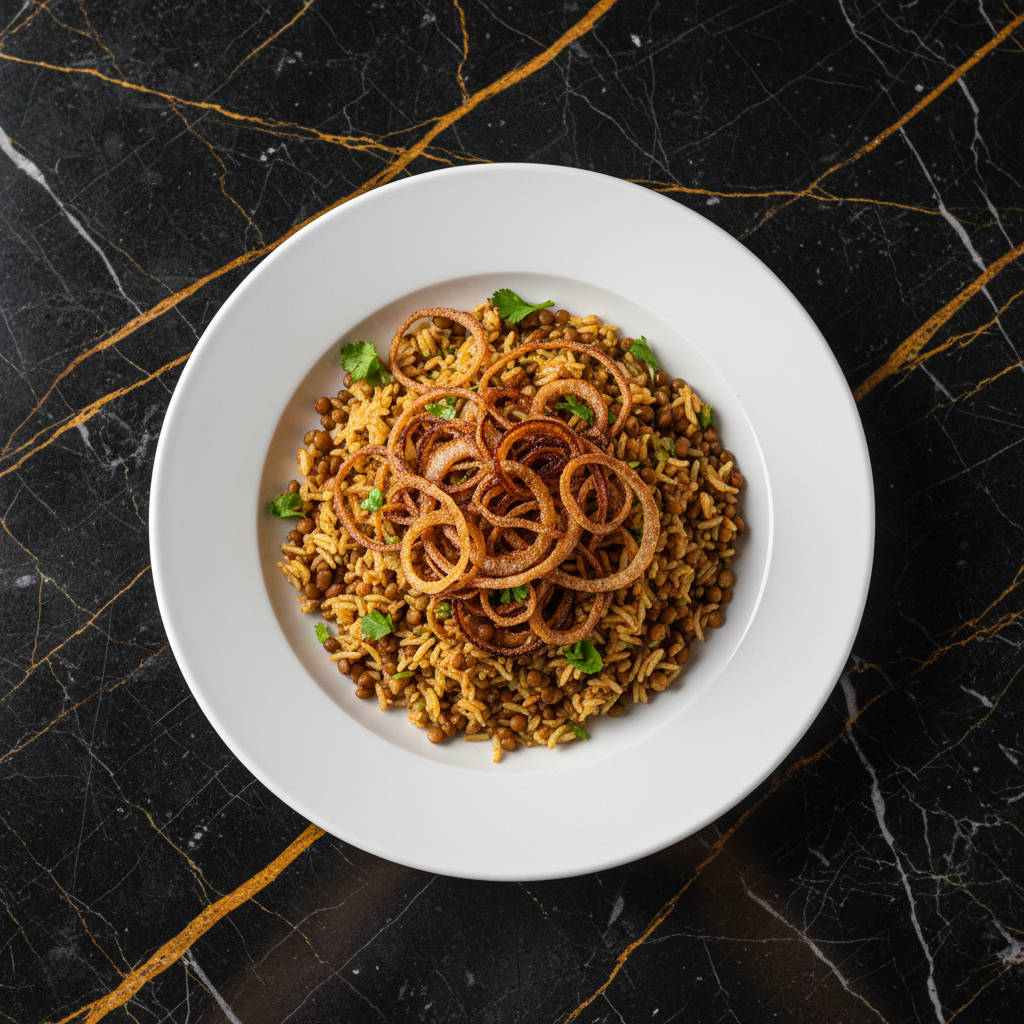 A comforting and flavorful dish of lentils and rice, seasoned with aromatic spices and often topped with crispy fried onions. Mujaddara is a staple in Middle Eastern cuisine and a hearty vegetarian option.