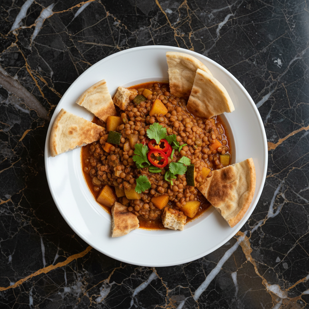 A hearty and comforting stew featuring tender lentils and a medley of vegetables simmered in a flavorful broth, reminiscent of the traditional Bahraini Thareed. This dish is often served with a side of crispy flatbread.