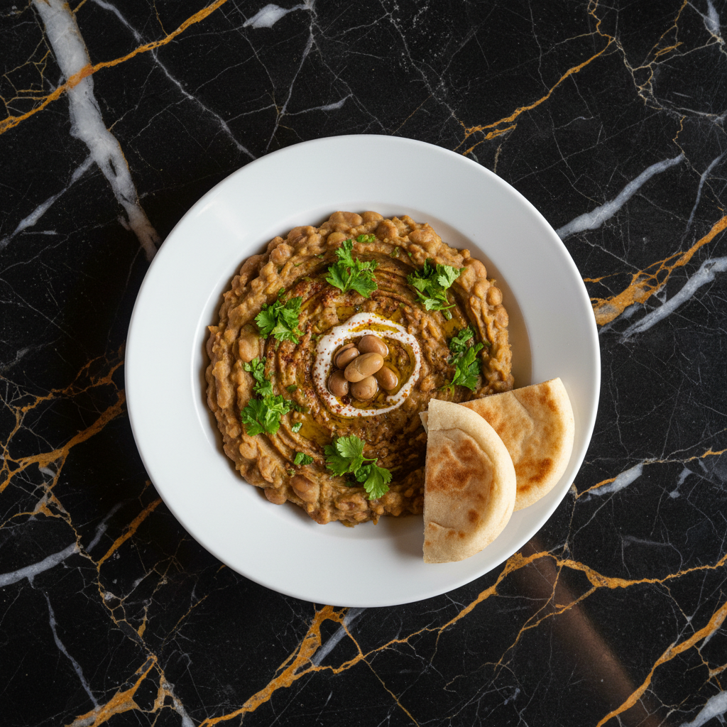 A hearty and flavorful dish of slow-cooked fava beans mashed with aromatic spices, often served for breakfast or as a side.