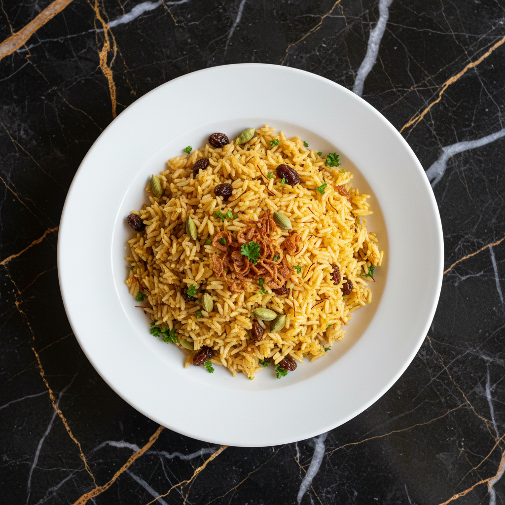 A fragrant and subtly sweet rice dish, often served as a side, featuring the delicate aroma of saffron and cardamom, complemented by plump raisins.