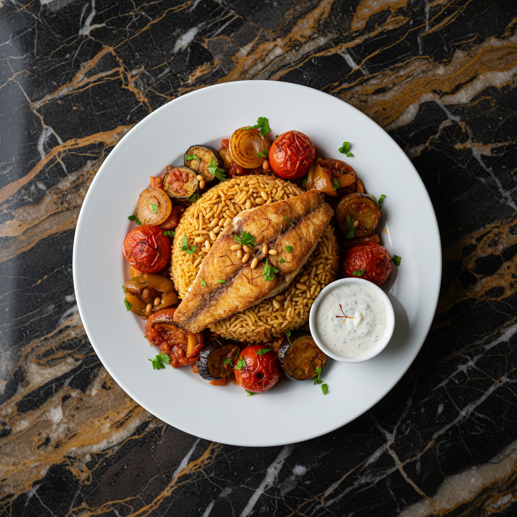 A visually stunning and flavorful upside-down rice dish featuring pan-fried fish, vegetables, and aromatic rice, a staple in Bahraini homes.