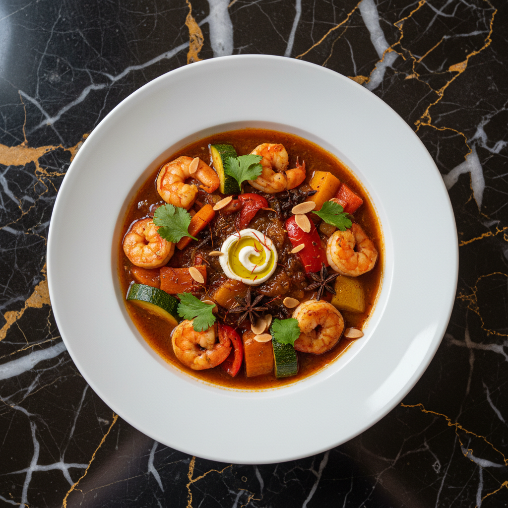 A flavorful and aromatic tagine featuring tender shrimp, a medley of vegetables, and a rich broth infused with Bahraini spices. This dish offers a delightful blend of savory and slightly sweet notes, perfect for a comforting meal.