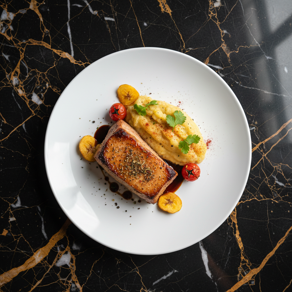 Tender pork loin marinated and roasted with a blend of aromatic Belizean spices, served with a sweet and savory mashed plantain side dish.