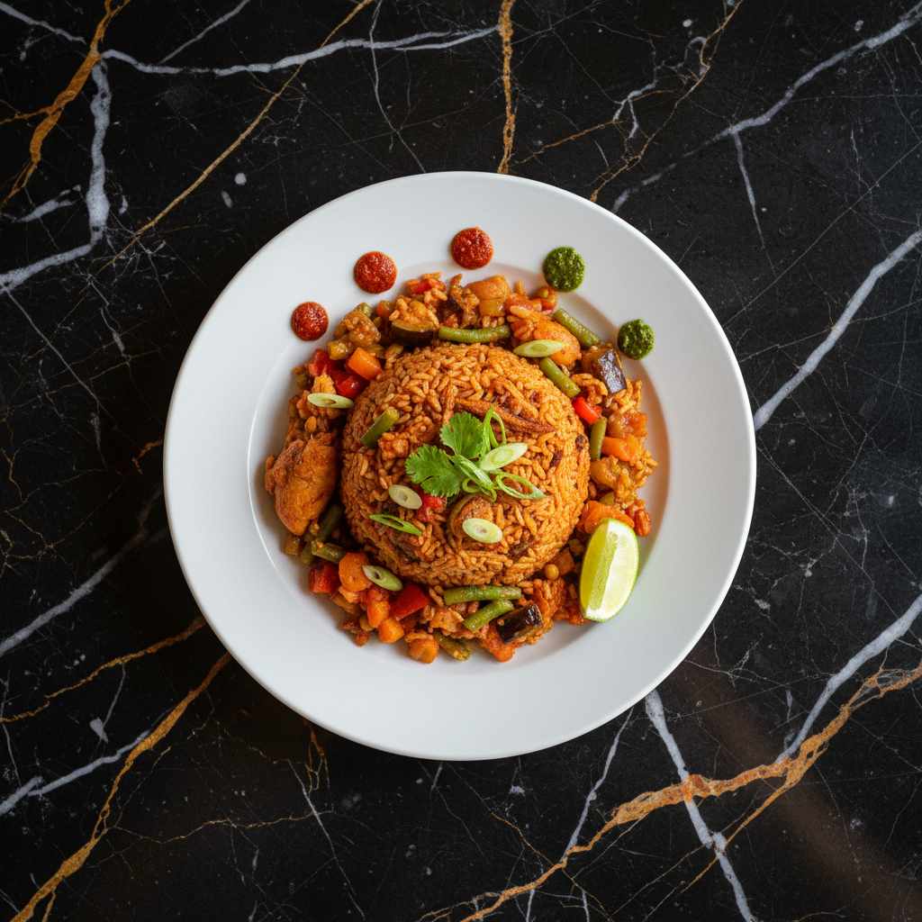 A flavorful and colorful one-pot dish of rice cooked with a variety of vegetables and often meat or fish, seasoned with a rich tomato and spice base.
