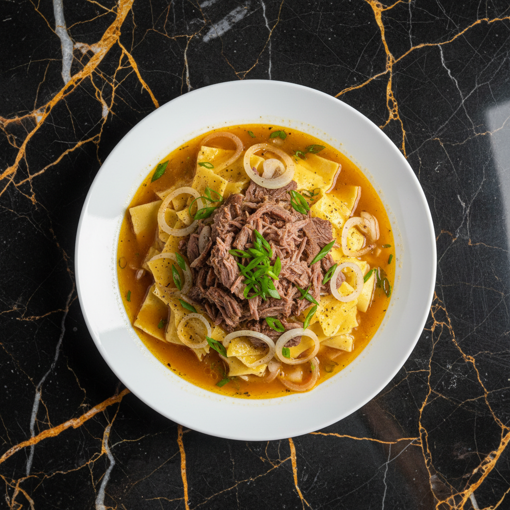 Beshbarmak, meaning 'five fingers,' is the national dish of Kazakhstan, traditionally eaten by hand. It consists of finely chopped boiled meat (often horse or lamb) served over large, thin squares of unleavened dough, all drenched in a rich broth called 'tuzdyk'.