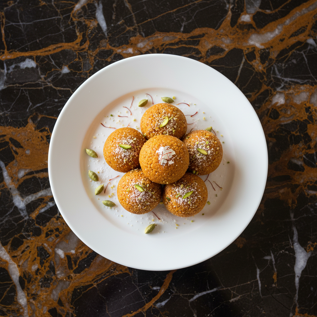 Delicious and aromatic chickpea flour (besan) balls, sweetened and bound with ghee, often adorned with nuts. A quintessential Indian sweet for celebrations and festivals.