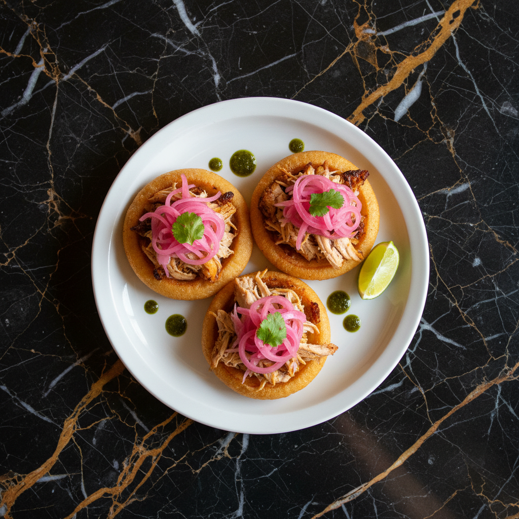 Crispy, puffed-up fried corn tortillas topped with seasoned shredded chicken, pickled onions, and fresh vegetables, salbutes are a beloved Belizean street food and appetizer.