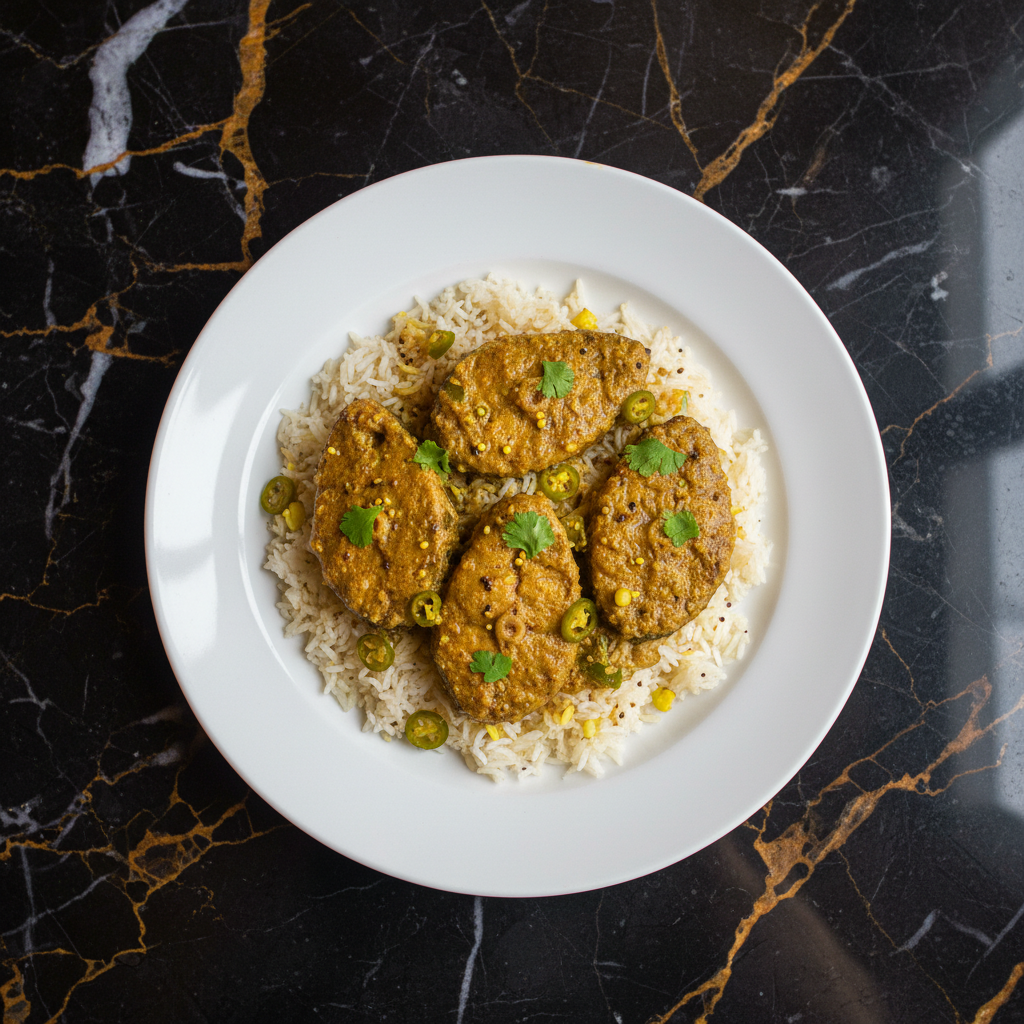 A classic Bengali delicacy where Hilsa fish is steamed with mustard paste, coconut, and spices, resulting in a tender and flavorful dish.