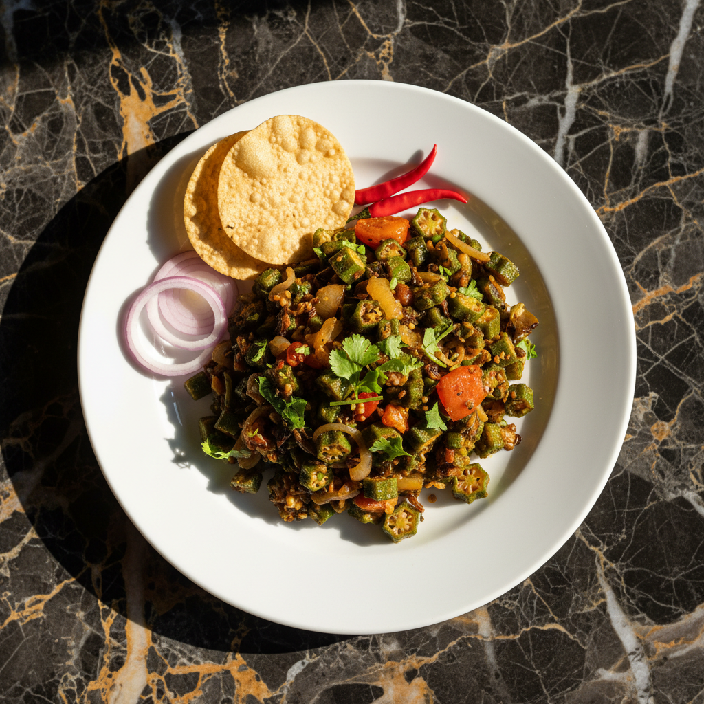 A popular and flavorful Indian dish featuring okra stir-fried with onions, tomatoes, and a blend of aromatic spices. This 'dry' preparation ensures the okra is tender yet not slimy, making it a delightful everyday vegetable accompaniment.