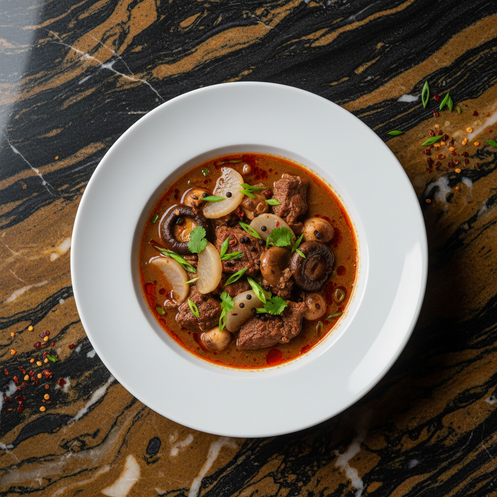A hearty and warming stew featuring tender beef, earthy mushrooms, and crisp radish in a flavorful broth, often spiced with local peppercorns.