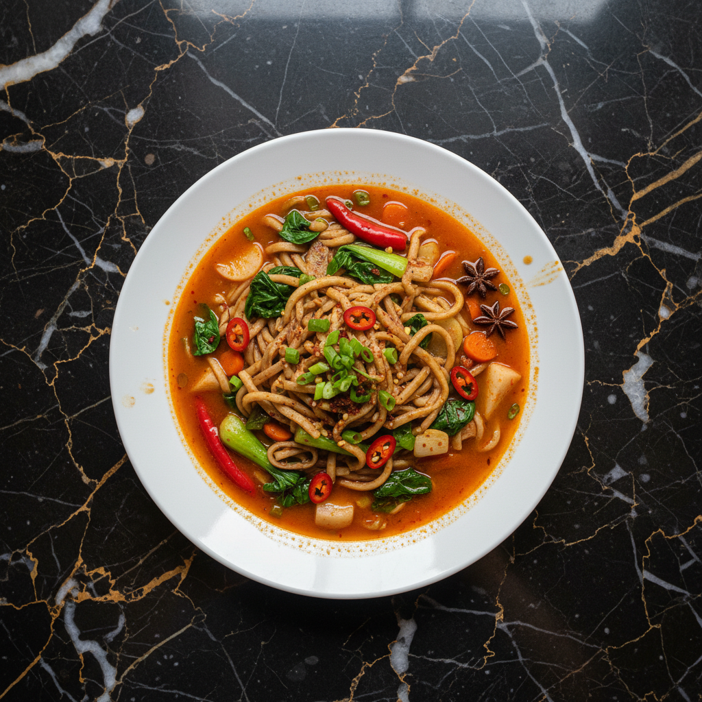 A hearty and flavorful noodle soup, this dish features homemade buckwheat noodles in a robust, spicy broth packed with local vegetables. It's a comforting and nutritious meal, often enjoyed during colder months.