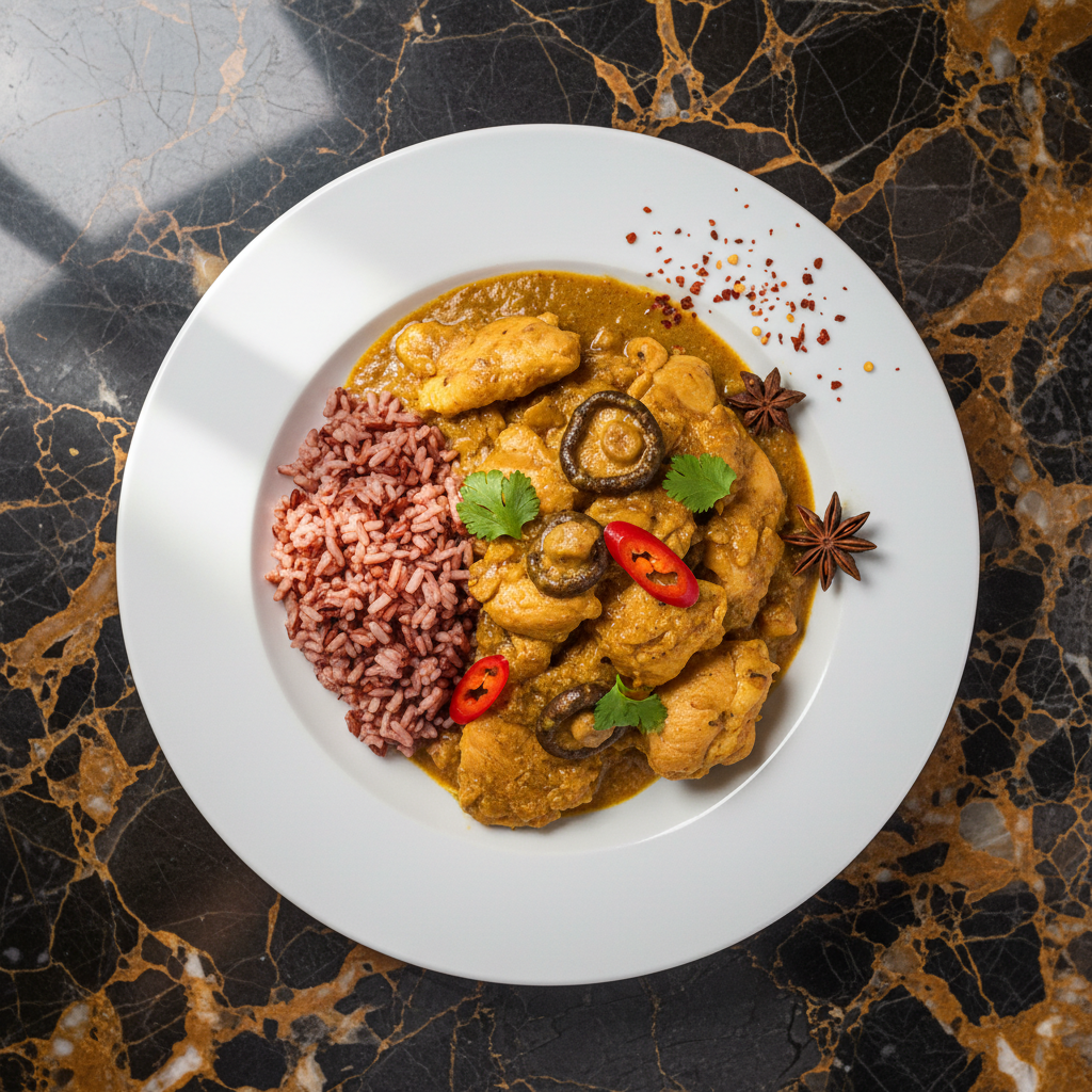 A fragrant and flavorful curry featuring tender chicken and earthy mushrooms simmered in a rich, spiced sauce, often with hints of ginger, garlic, and chili. This dish is a comforting and aromatic representation of Bhutanese home cooking.