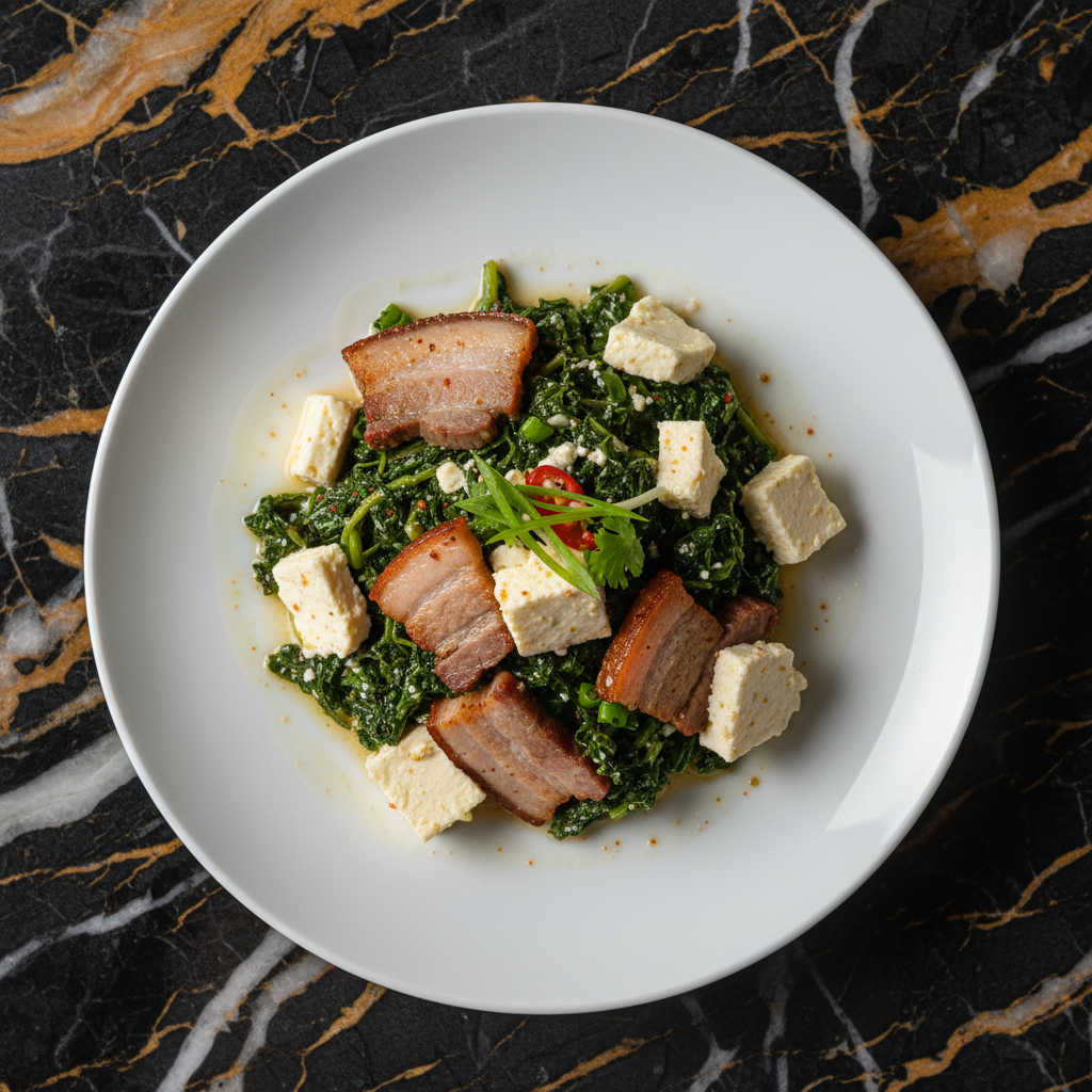 Bhutanese Fermented Greens with Cheese and Pork Belly