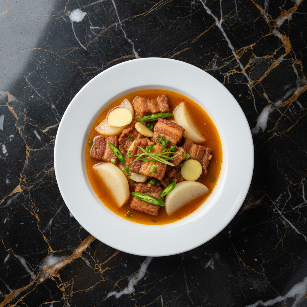 A warming and hearty stew featuring tender chunks of pork belly simmered with earthy turnips and a generous amount of fresh ginger, creating a dish with a delightful balance of savory, slightly sweet, and pungent flavors. This is a classic Bhutanese comfort food, often enjoyed during colder months.