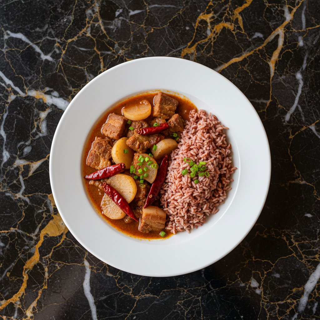 Phaksha Paa is a flavorful and spicy Bhutanese stew featuring tender pork belly cooked with radishes, dried red chilies, and aromatic spices. It's a hearty dish often served with Bhutanese red rice.