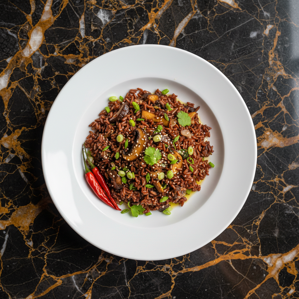 A fragrant and nutty pilaf made with distinctive Bhutanese red rice, sautรฉed mushrooms, and aromatic herbs.
