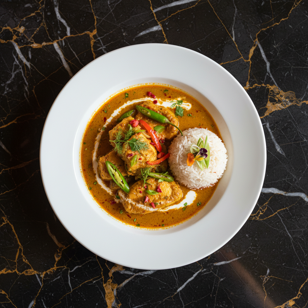 A fragrant and subtly spiced curry featuring fresh river fish, simmered in a rich broth infused with aromatic local herbs and a touch of chili. This dish highlights the fresh produce and traditional flavors of Bhutan, often prepared in communities near rivers.