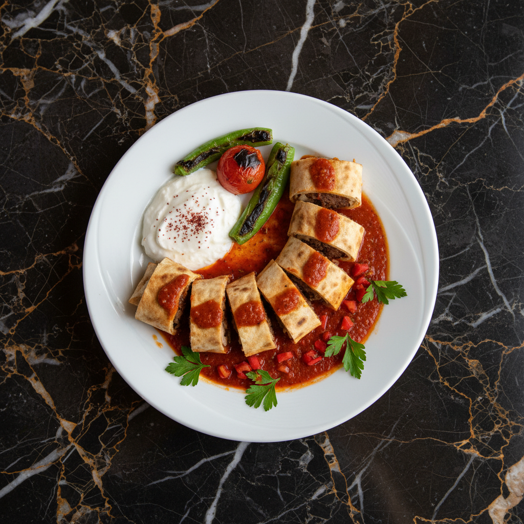 A modern Turkish classic, this Beyti Kebab features flavorful Adana-style ground lamb, seasoned and grilled, then wrapped in soft lavash bread and generously topped with a rich tomato-butter sauce and cooling garlic yogurt. It's an indulgent and satisfying dish.