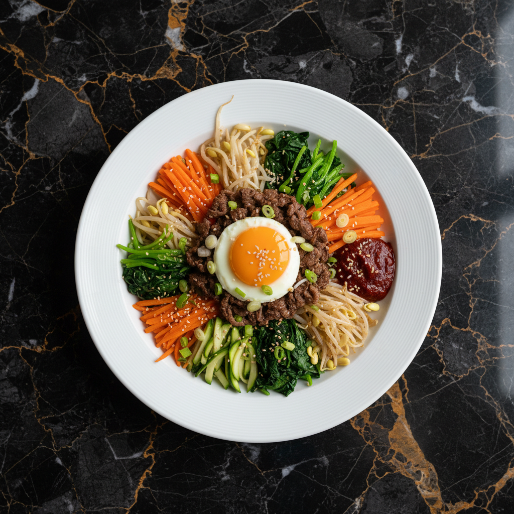 A vibrant and flavorful Korean mixed rice bowl featuring a medley of seasoned vegetables, tender beef, a dollop of spicy gochujang, and a perfectly cooked sunny-side-up egg. The key to bibimbap is to vigorously mix all the components together before each bite for a harmonious blend of tastes and textures.