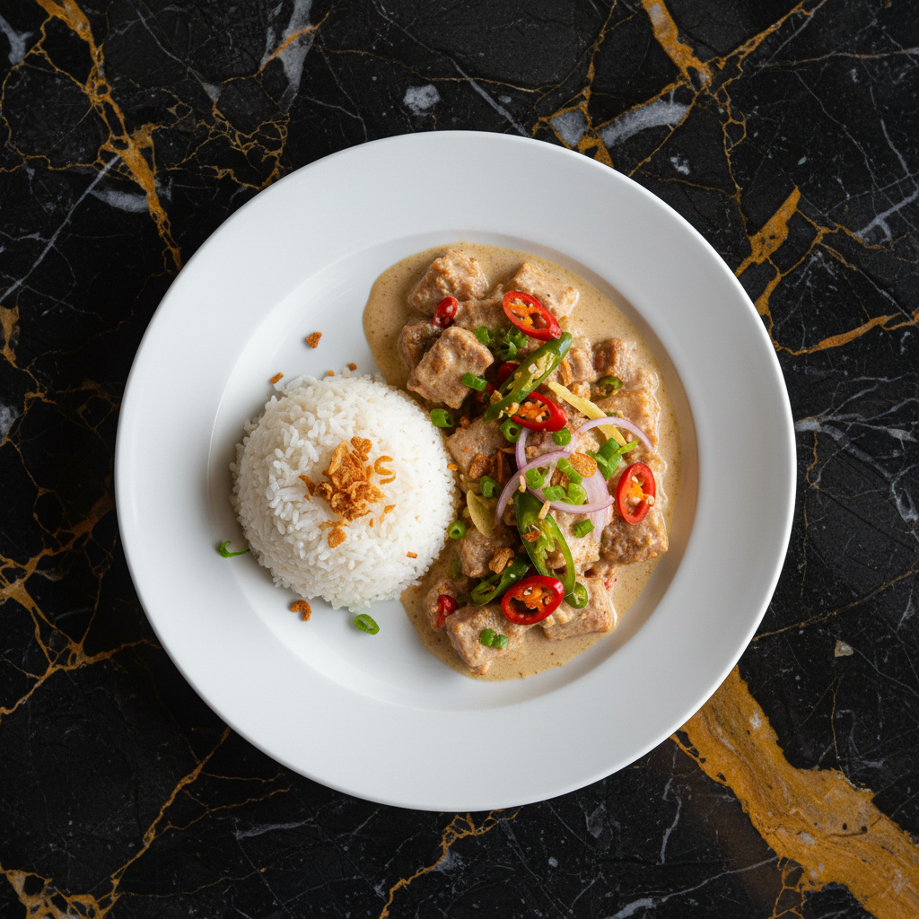 A rich and spicy Filipino stew featuring tender pork belly simmered in creamy coconut milk with pungent shrimp paste and a generous amount of chilies. This Bicolano classic is known for its intense heat and savory depth.