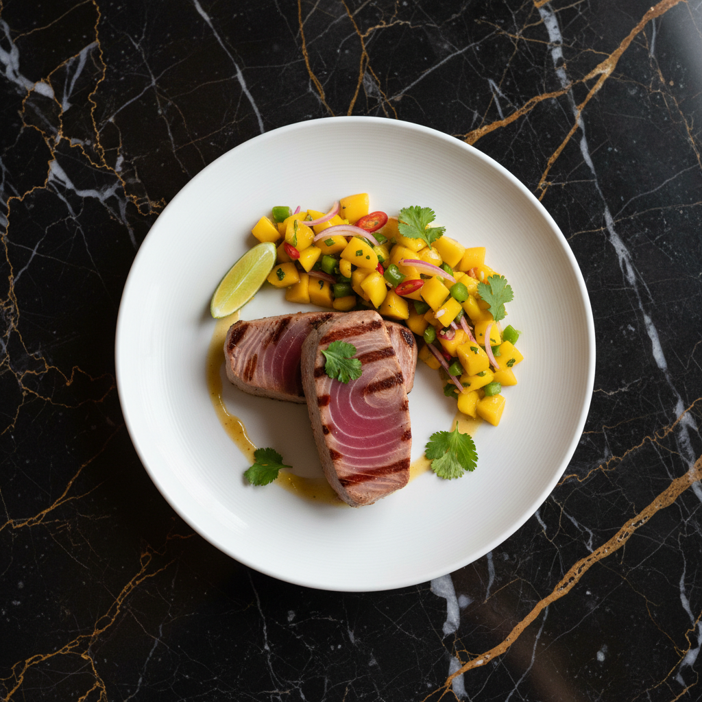 Grilled tuna steaks served with a vibrant and slightly sweet mango salsa, offering a tropical twist to a classic Cape Verdean ingredient.