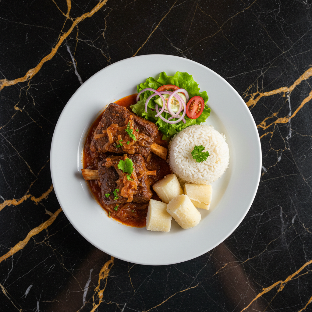 A hearty and flavorful beef rib stew, slow-cooked in a pot with onions and seasonings until tender. Often served with mandioca (cassava) and a side of rice or salad.