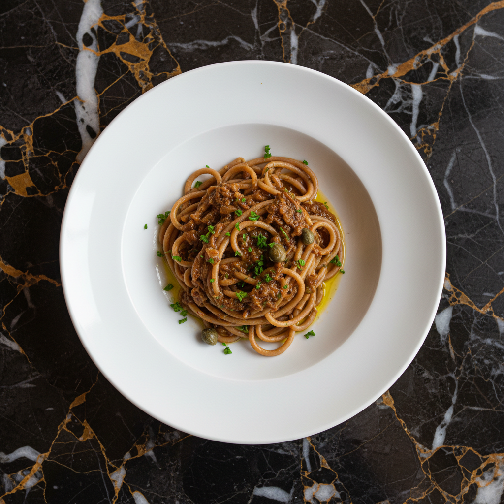 A traditional Venetian dish featuring thick, whole wheat spaghetti (bigoli) served with a simple yet flavorful sauce made from onions and salt-cured anchovies.