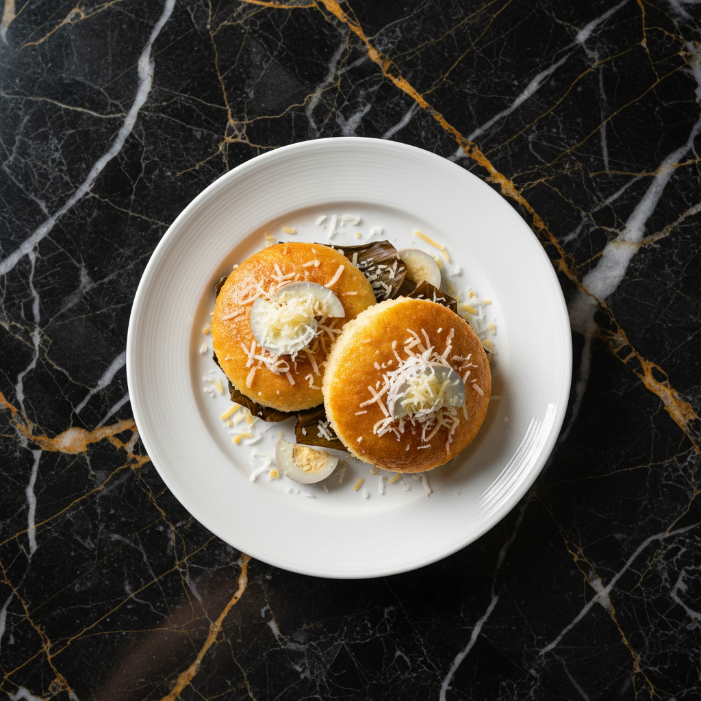 A traditional Filipino sweet rice cake, often baked in a clay pot lined with banana leaves, especially popular during the Christmas season. It has a slightly spongy texture and a subtly sweet, coconutty flavor, typically enhanced with toppings.