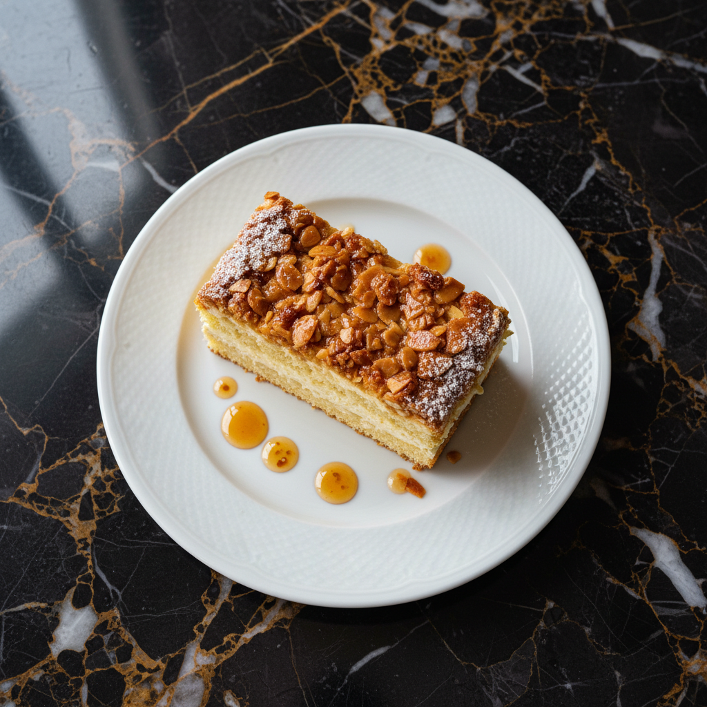 A classic German cake featuring a rich yeast dough base, topped with a sticky, caramelized honey-almond mixture, and filled with a luscious vanilla custard. The name 'Bee Sting' is said to come from the legend that bakers threw dough at their overlords like bees stinging them, or that bees were attracted to the sweet aroma.