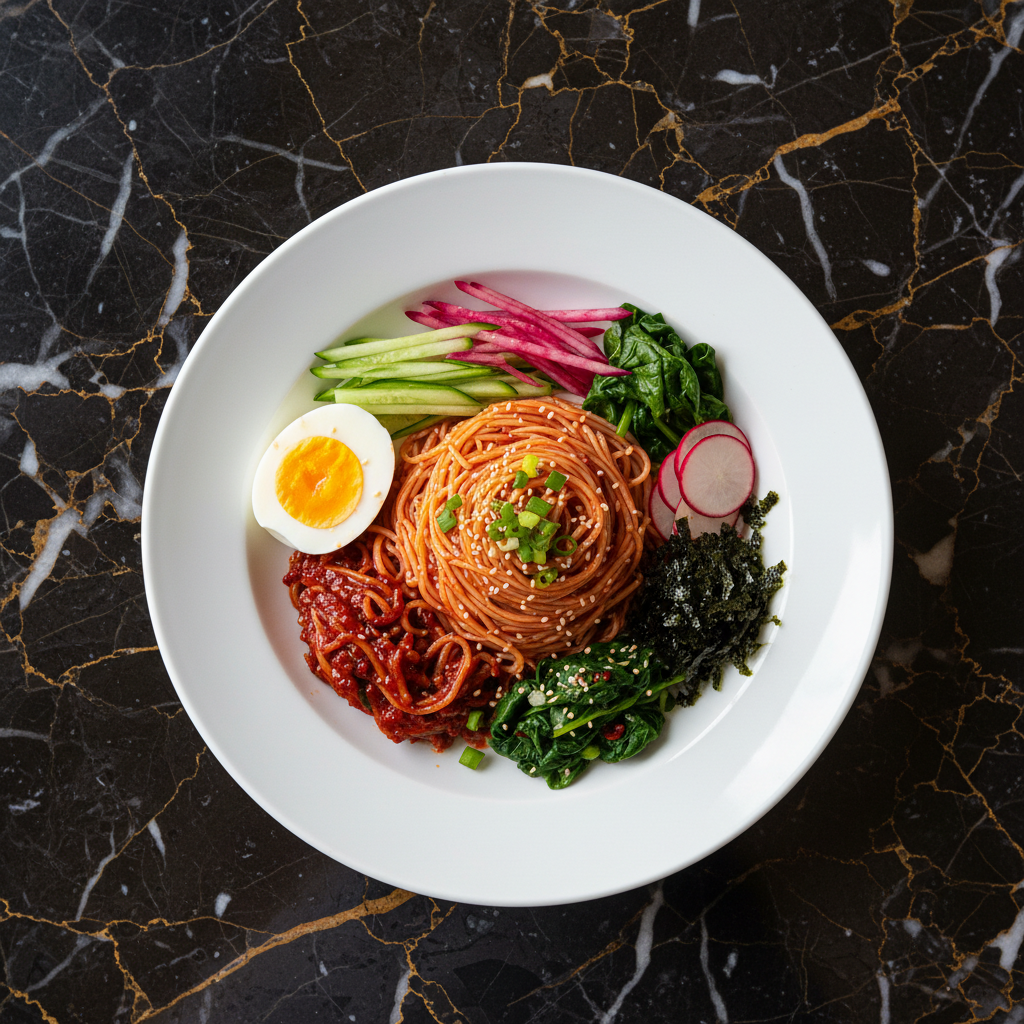 A vibrant and refreshing Korean dish featuring chewy wheat noodles tossed in a sweet, spicy, and tangy gochujang-based sauce, topped with crisp vegetables and a hard-boiled egg. Perfect for a quick and satisfying meal, especially on a warm day.