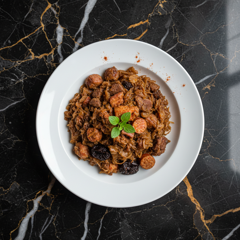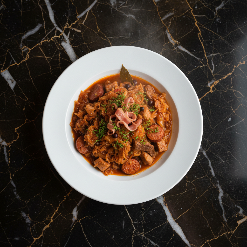 Poland's national dish - a legendary hunter's stew featuring sauerkraut, fresh cabbage, and a medley of meats, traditionally simmered for days. Its flavor deepens and improves with each reheating, making it even better the next day.